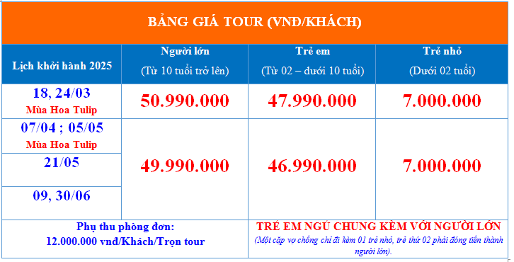 5. Phụ thu phòng đơn (nếu có): 12.000.000 vnđ/ khách/ tour.
