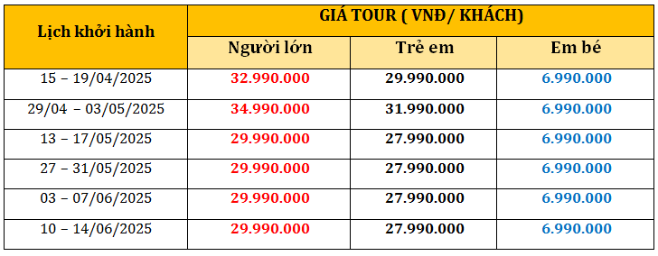 - Người lớn (từ 11 tuổi trở lên): 100% giá tour người lớn.