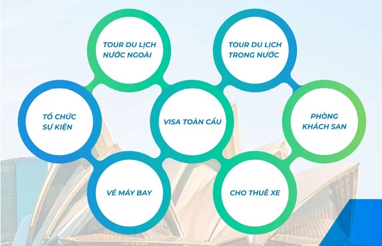 - Tour du lịch nước ngoài: chuyên các tuyến tour du lịch Úc, Mỹ, Canada, Châu Âu, Nhật Bản, Hàn Quốc, Trung Quốc, Đài Loan, Singapore Malaysia, Thái Lan